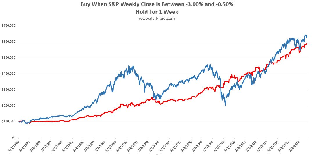 Featured in Zero Hedge Daniel Drew, 10/10/2016 Tweet Every single boilerplate disclaimer out there says past performance does not predict future returns. They then proceed to tell you about their magical formula, their genie in the lamp, their fibonacci retracement, or their fund manager from Harvard who hasn't blown up his first trading account yet. What if past performance actually does predict future returns, and it just so happens to be something as simple as mean reversion in weekly price performance? One chart shows exactly why weekly price performance matters. This is what happened to anyone who only bought after the market was up for the week. Anyone who buys when the market is up has the odds stacked against him more than he realizes. An investor who only bought the S&P; 500 after it went up and held for a week ended up losing a total of 4% since 1990. Conversely, anyone who bought the index when it was down between -3.00% and -0.50% for the week nearly matched the market's return without having a major drawdown. Buying whenever the market was down more than 3.00% for the week was not a good idea. When the market was down that much, something was seriously wrong with the market, and more losses followed. If the astute investor wanted to leverage his returns, the low volatility of this strategy would certainly allow him to. |